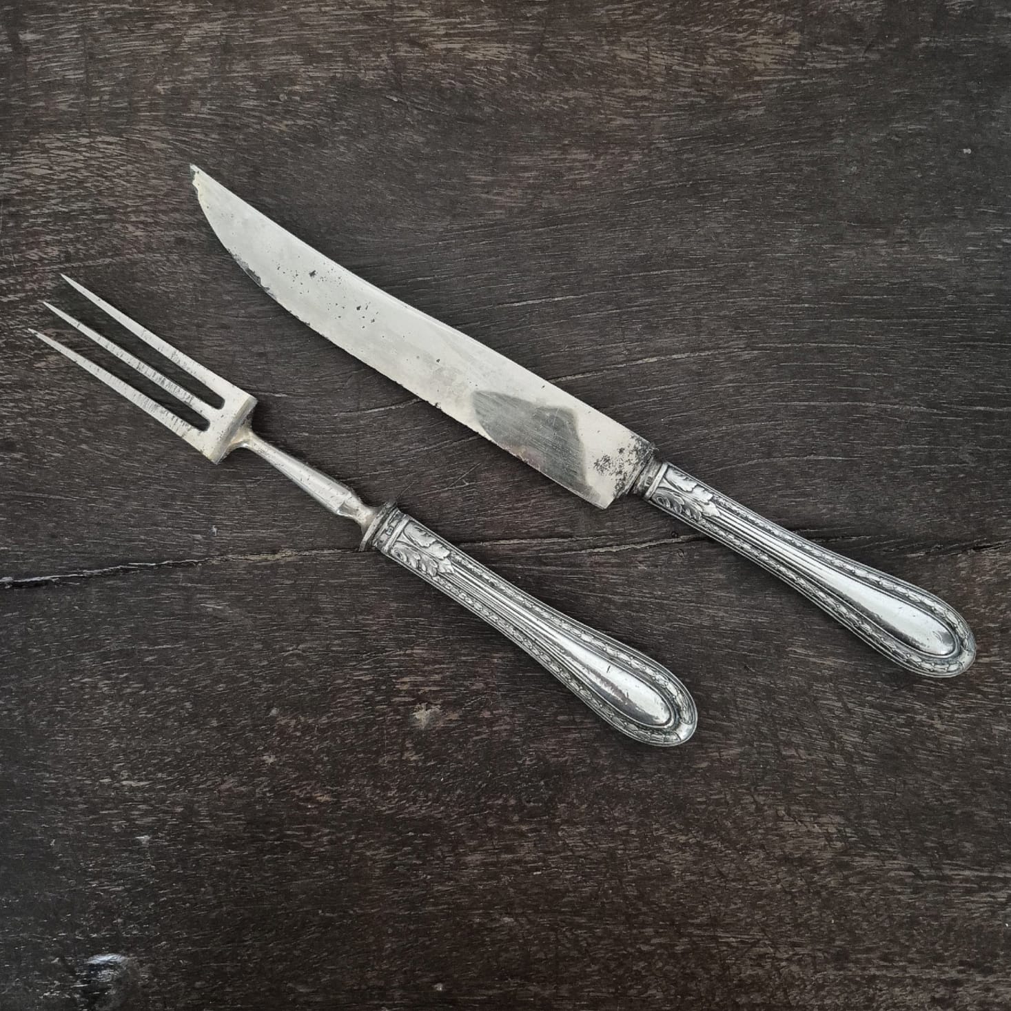 Conjunto Trinchante em Prata 800 de Época Garfo 28 cm Faca 32 cm Este requintado conjunto de servir, composto por faca e garfo trinchante, é um exemplar autêntico da prataria europeia de transição entre o final do século XIX e o início do século XX. O grande diferencial destas peças reside em seus cabos, confeccionados em Prata 800 — uma liga metálica historicamente prestigiada por sua durabilidade e brilho característico, muito comum em centros de excelência na fabricação de metais, como a Alemanha e a Itália. O design das peças é uma celebração ao estilo Neoclássico, remetendo à estética Luís XVI. Nota-se um trabalho de cinzelaria detalhado, onde frisos verticais se fundem a delicadas guirlandas de folhas e ornamentos de acanto na base dos cabos. A pátina natural do tempo, preservada nos baixos-relevos, não apenas atesta a antiguidade do conjunto, mas também confere uma profundidade visual que destaca a riqueza dos ornamentos. Embora os cabos ostentem a sofisticação da prata, as partes funcionais — a lâmina da faca e os dentes do garfo — são forjadas em metal de alta resistência. Essa combinação era a norma da época: a elegância da prata para o manuseio e a força do aço para o serviço de carnes e aves. A faca apresenta uma silhueta robusta, ideal para cortes precisos, enquanto o garfo exibe dentes longos e afiados, característicos dos talheres de serviço de alta gama. Trata-se de um conjunto que transcende a utilidade doméstica, posicionando-se como um objeto de colecionismo e decoração. Seja para compor uma mesa posta com rigor histórico ou para integrar uma vitrine de antiguidades, estas peças carregam consigo o peso da tradição e a beleza atemporal da prataria clássica. Conservadas em seu estado original, as peças apresentam marcas de uso condizentes com sua trajetória, reafirmando sua identidade como itens vintage legítimos.