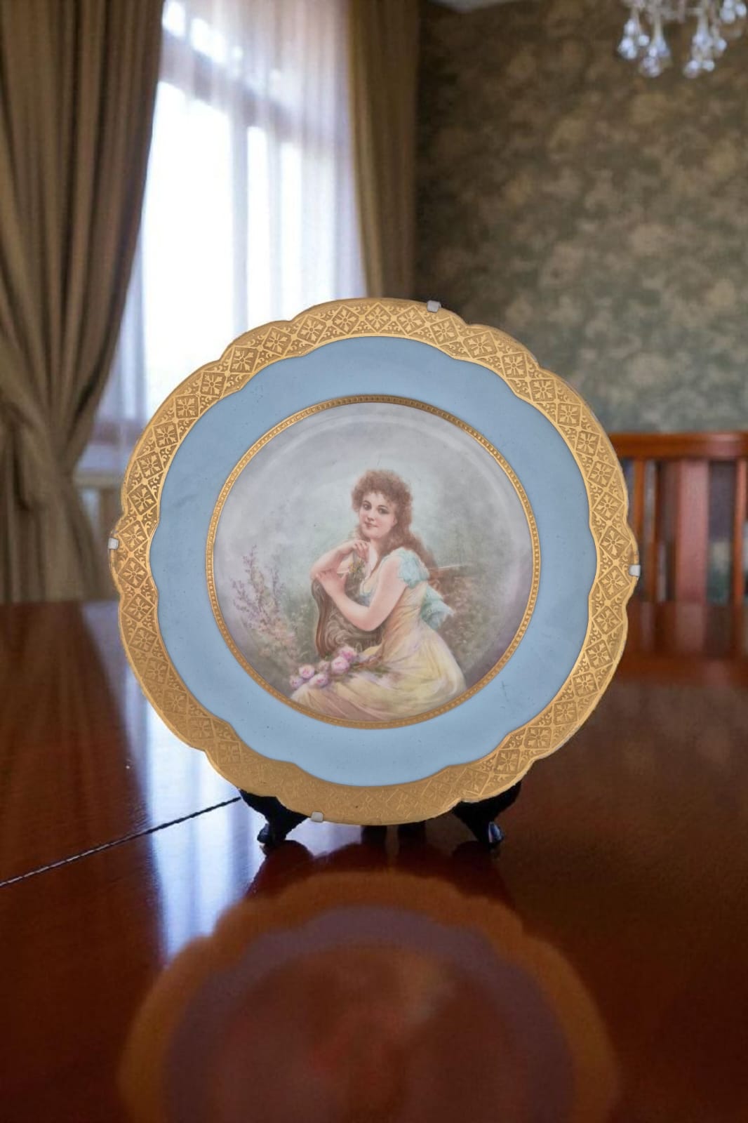 Prato decorativo em porcelana possivelmente Velho Paris, século XIX, com delicada pintura à mão representando uma jovem em meio às flores. A borda apresenta riquíssimo trabalho em douração com relevos geométricos, típico da sofisticação francesa da época.