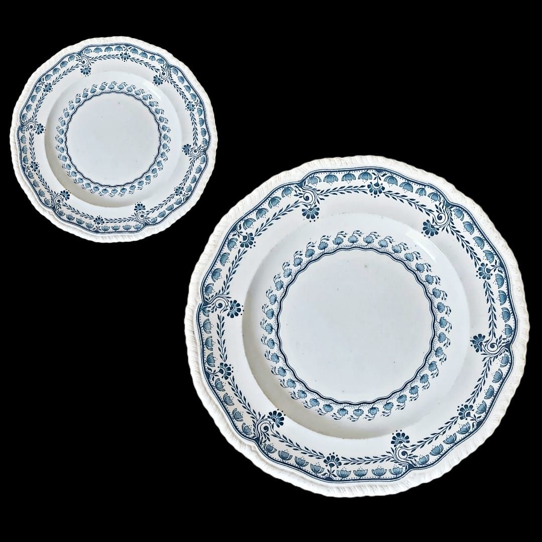 Par de pratos de parede em porcelana inglesa Minton azul e branca vendida pela renomada loja de luxo francesa Le Grand Dépot de Emile Bourgeois.