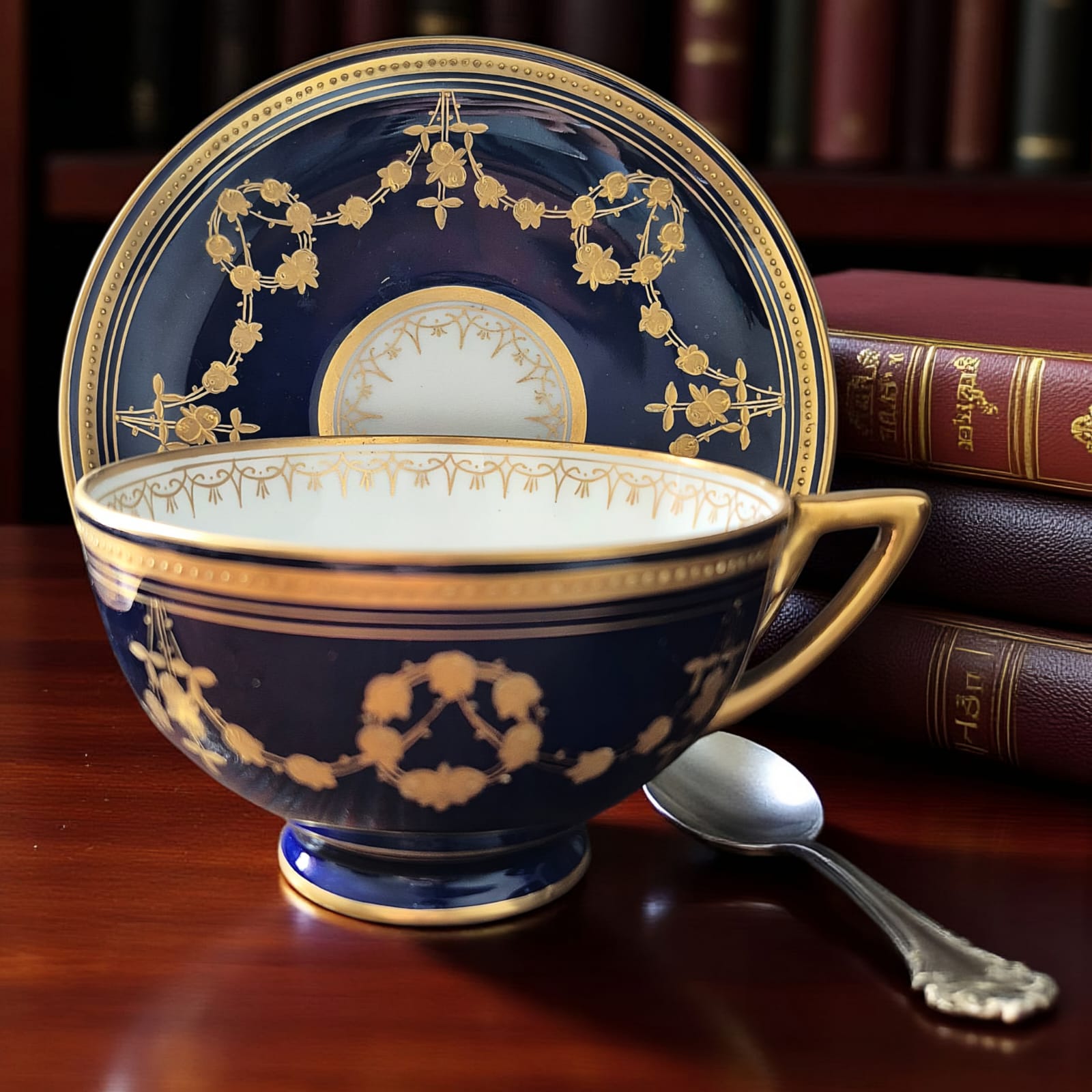 A delicadeza do azul cobalto profundo contrasta com o dourado minuciosamente aplicado, formando guirlandas e arabescos que revelam o requinte estético da época. A alça, também dourada, demonstra não apenas funcionalidade, mas o apuro artístico característico da manufatura austríaca.